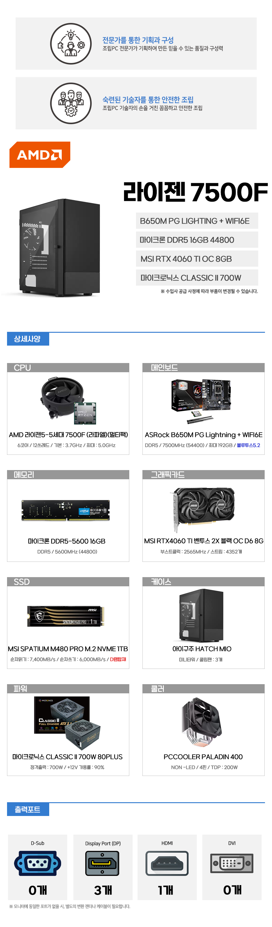 기본) AMD 7500F RTX4060 TI 게이밍 QHD 조립 컴퓨터